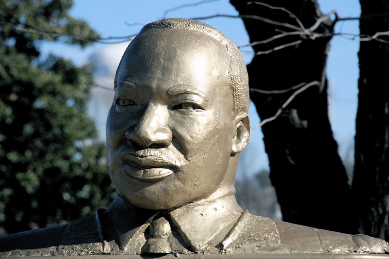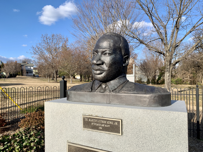 A metal bust of Dr. Martin Luther King Jr. created by Wilbur Lee Map stands on a stone base featuring plaques on both the front and back. Martin Luther King Jr., who appears to gaze into the distance, is depicted as he looked the day of his death. The bust long stood on the corner of South Elm Street and Martin Luther King Jr. Drive. However, it was restored and was installed in the Fall of 2022 in a new location at the North-East corner of Bragg St and MLK Drive.