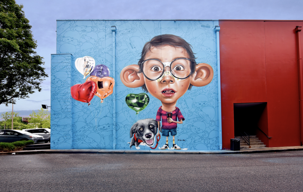 Just like all the other “Big Ears” characters this wall refers to the juvenile and kids’ world. This one is of a boy that has pimples and is using a band-aid to hide some of it. Sipros’ intention was to use the bandage to attract more attention to the piece. The boy is walking with his dog and drinking soda. He also added balloons to allow people to interact with the art.