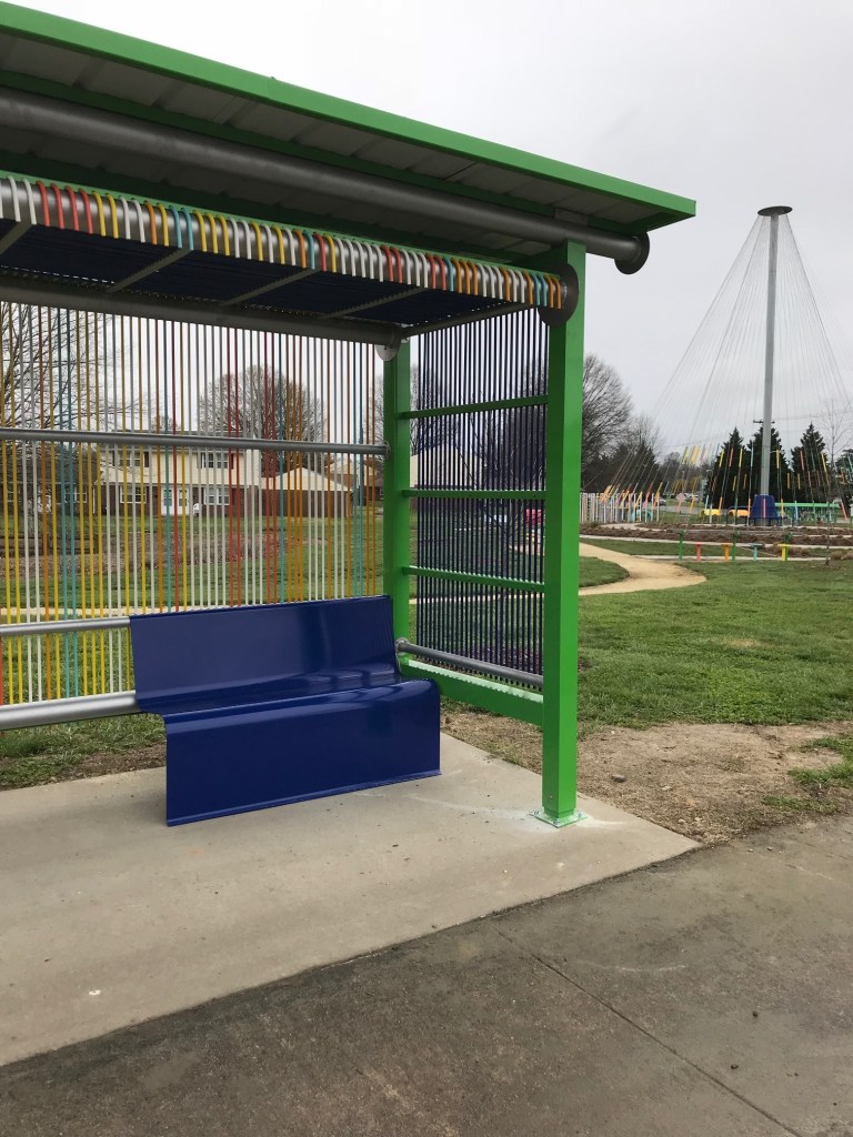 Artist Randy Walker designed and fabricated two bus shelters with the theme of the Revolution Cone in mind. One shelter was installed on the Downtown Greenway in spring 2018 and is located adjacent to Woven Works Park at the corner of Lindsay and Cumberland Avenue. An identical bus shelter will be installed on Murrow Boulevard between Market Street and Lindsay Street upon completion of Phase 2 along Murrow Blvd.