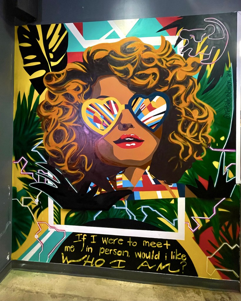 A vibrant portrait of a woman with curly hair surrounded by elements of Miami imagery.